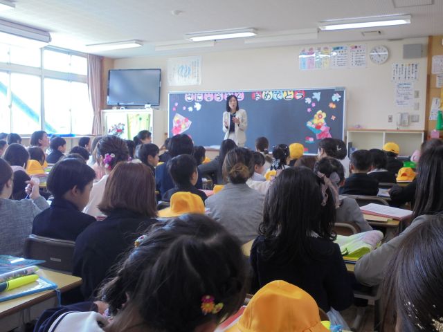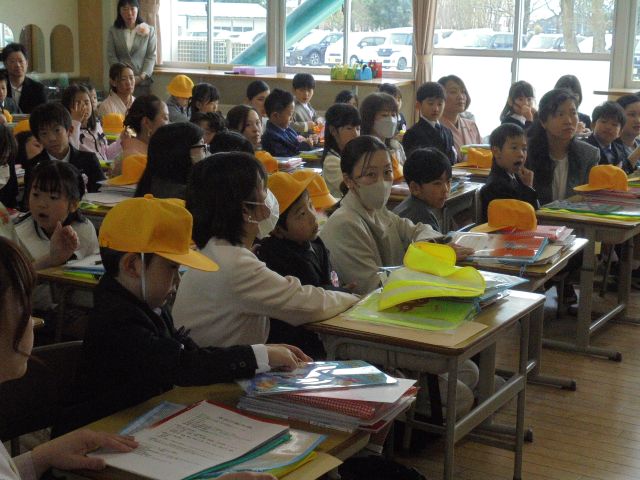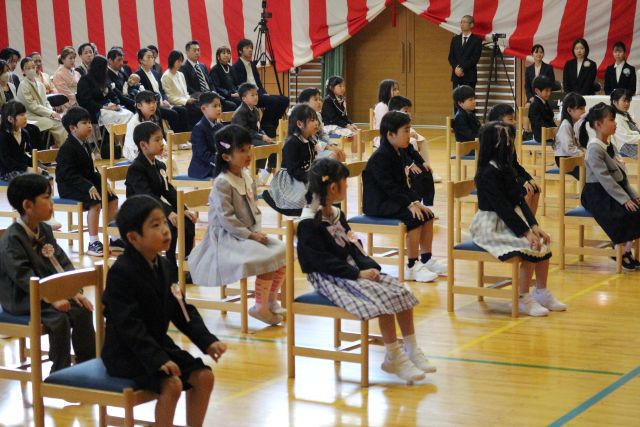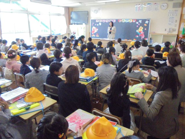 今年の1年生は、なんと35名1クラスです。たくさんのお友達と仲良く生活していきましょう!保護者の皆さんにも教室に入っていただき、様子を見ていただきました。教室がパンパンです(笑)。
