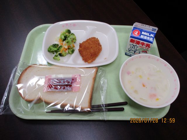 冬季オリンピックシリーズ3日目。今日はカナダ風献立としてサーモンフライとメープルシロップが登場しました。肉厚のカラッと揚がったサーモンは食べ応えがありました。食パンにはメープルシロップをかけ、おいしくいただきました。クリームチャウダーもおいしかったです。