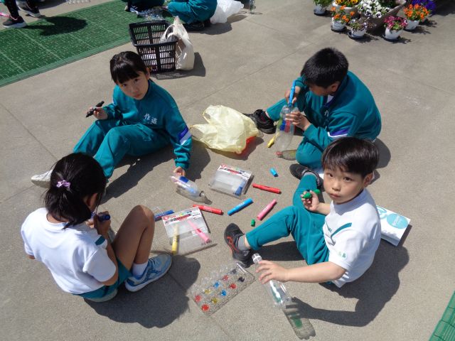 ペットボトルや卵のパックにマジックで色を付け、カラフルな影をつくりました。