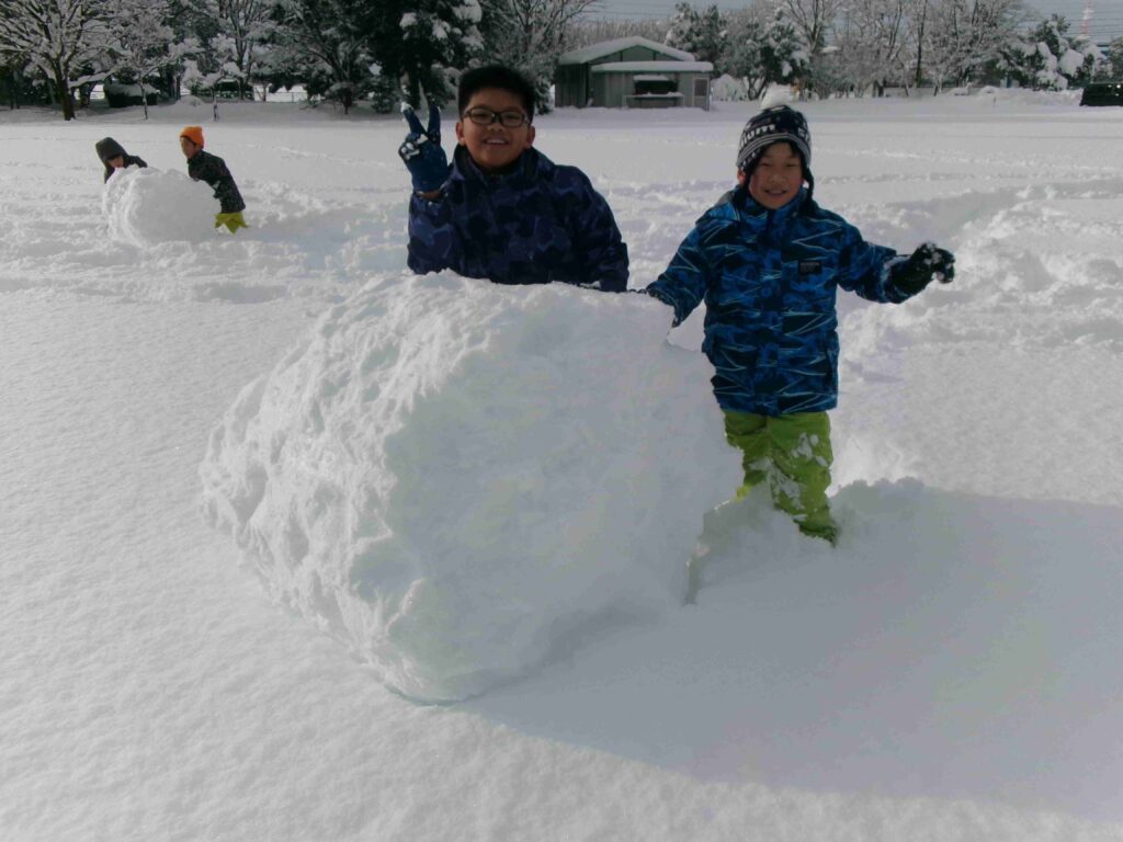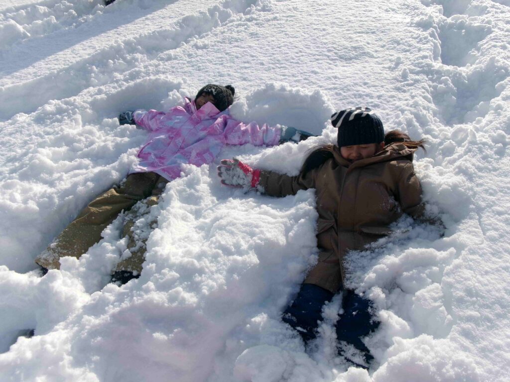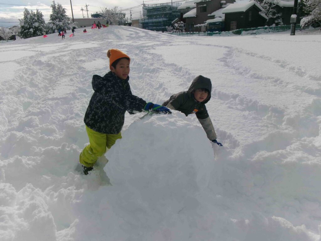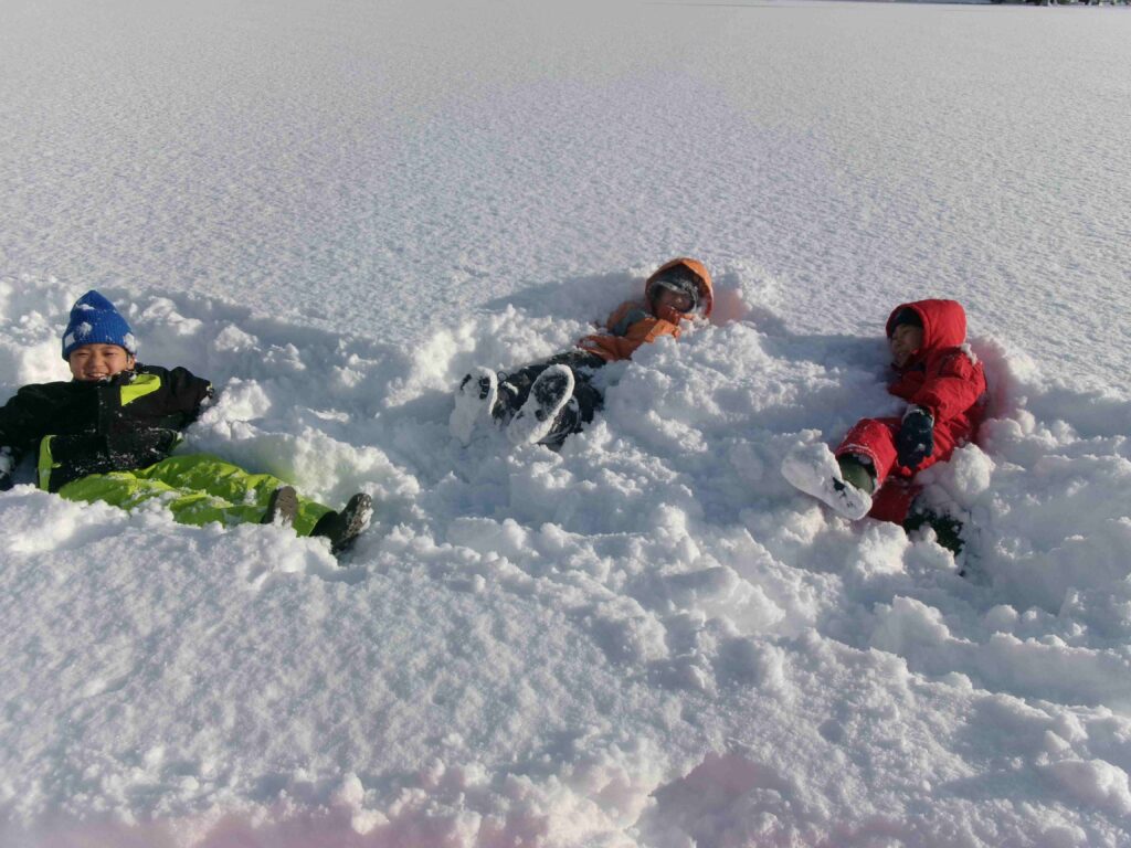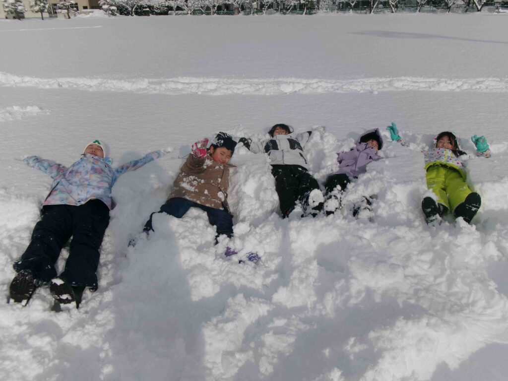 校庭にフカフカの雪がたっぷり積もりました。雪をかき分けて走ったり、雪の中に寝転んだり、そりや雪だるま作りをして、思う存分、雪を楽しんだ3年生です。
