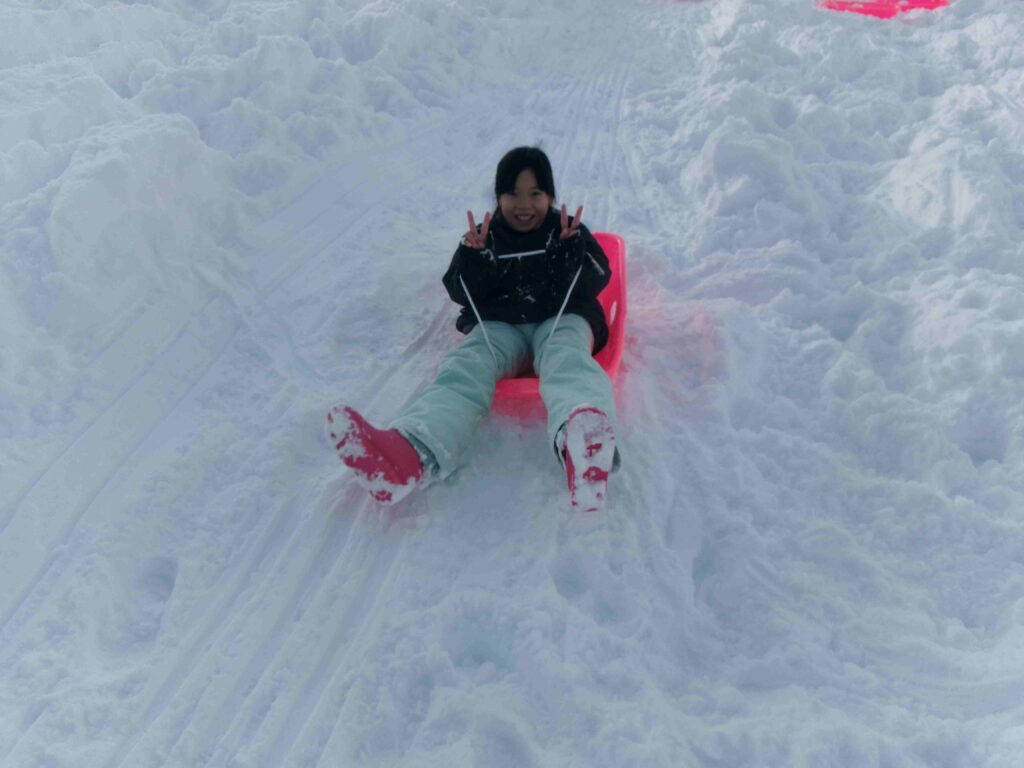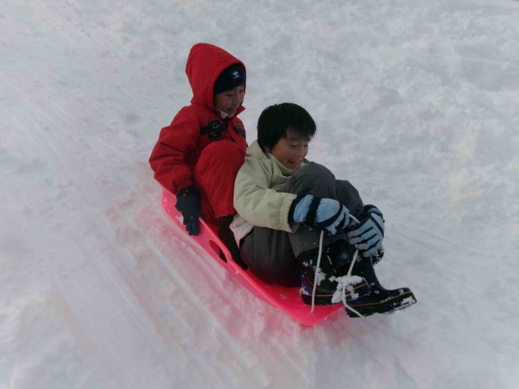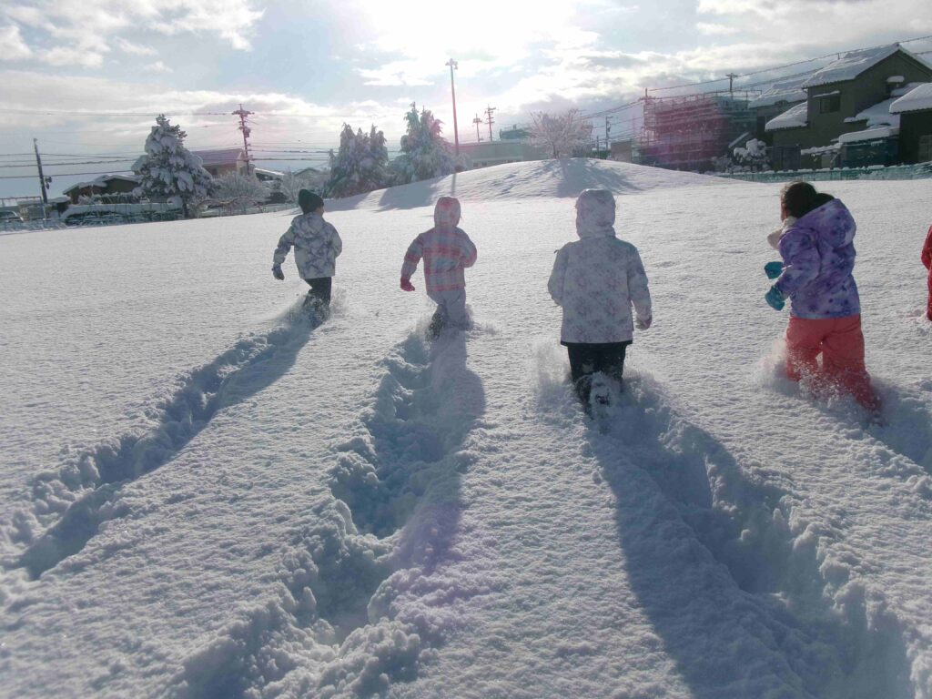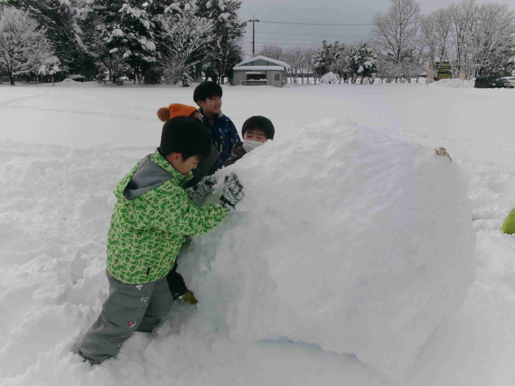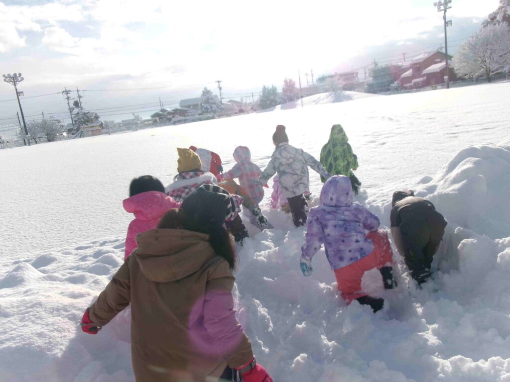 校庭にフカフカの雪がたっぷり積もりました。雪をかき分けて走ったり、雪の中に寝転んだり、そりや雪だるま作りをして、思う存分、雪を楽しんだ3年生です。