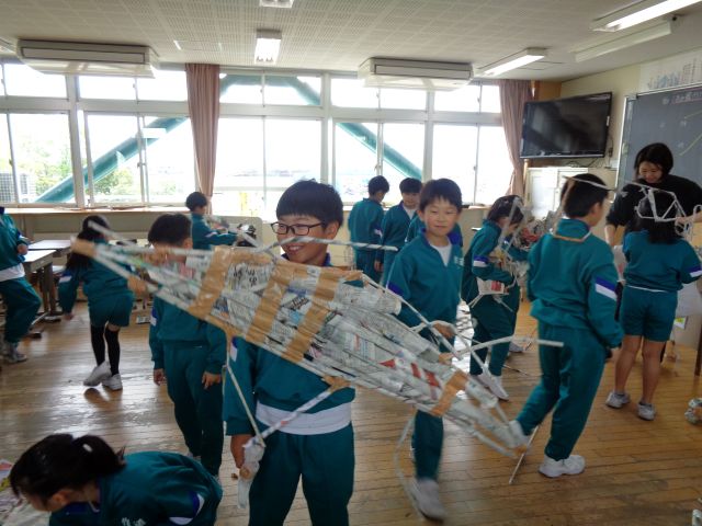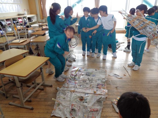 4年生 新聞で遊ぼう(図工) Posted on 2026/04/28 by kotyoIn R8(4年) 新聞を折ったり、細く丸めたりして、いろいろなものを作りました。輪投げや巨大なザリガニ等、思い思いに作っていました。