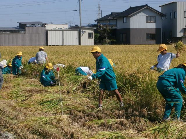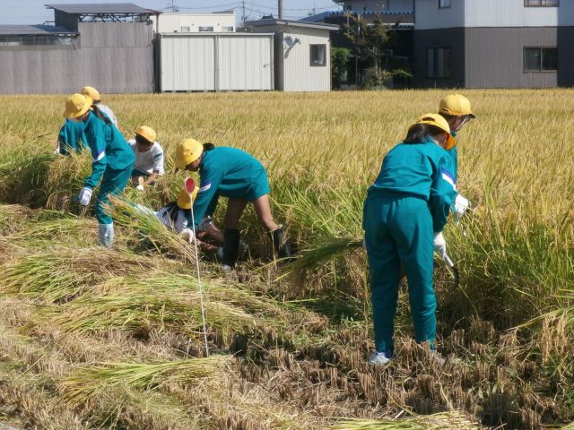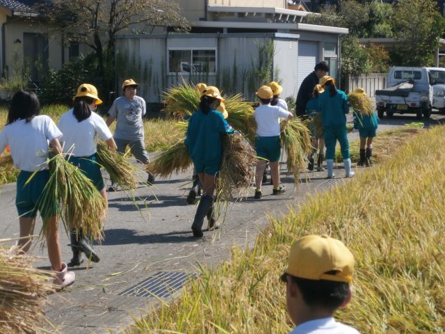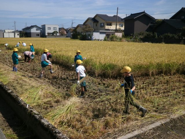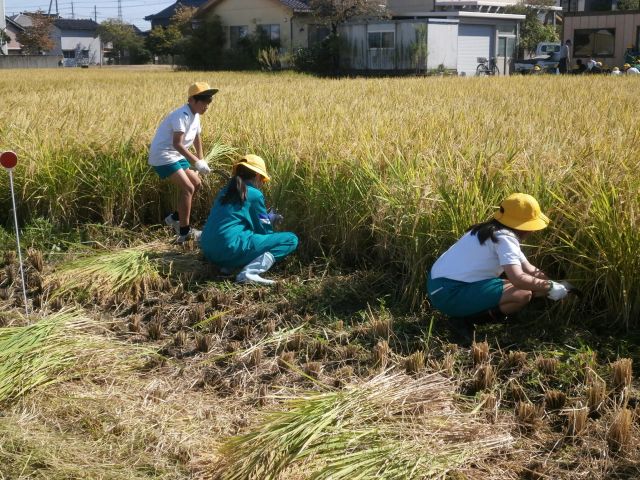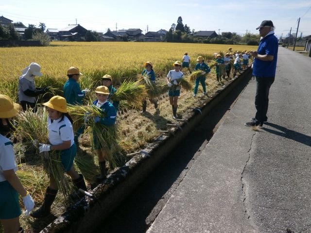 24日(水)。秋晴れの下、5年生はファーム作道さんのご協力をいただいて、稲刈りを行いました。春に植えた苗が実り、立派な米に成長した稲を丁寧に刈りました。「てんこもり」という品種のお米を刈らせていただきました。刈っても刈っても終わりが見えない田んぼの大きさに、苦労していました。