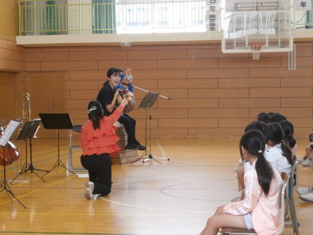 演奏を聴くだけでなく「みちりんの冒険」と題して、児童が参加する場面もありました。冒険の様子を楽器で上手に表現され、児童は楽器に合わせて足と手で拍子を打っなど、音楽を体感し、大変盛り上がりました。冒険の最後には児童全員で「やー」と力強く声を合わせ、魔女を倒すことができました。