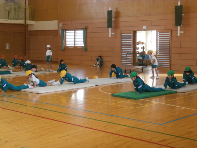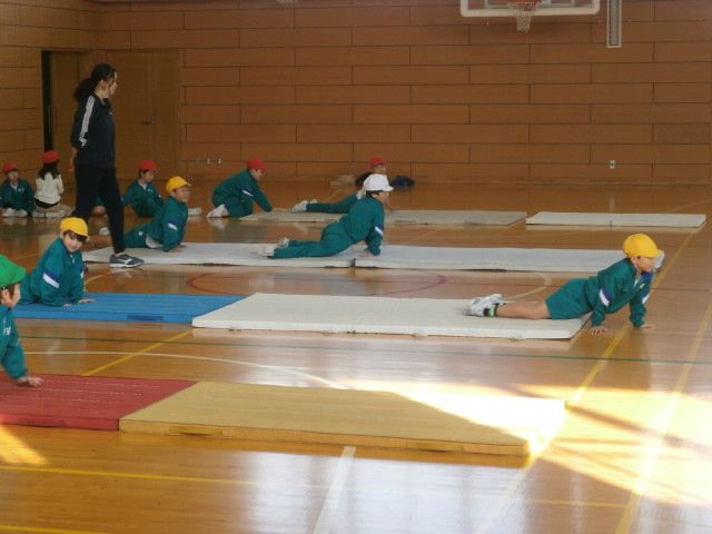 2年生は、体の柔軟性を高めるためにマット運動をしています。カエルの動きやアザラシの動きなど丁寧に指導を受けながら、元気に挑戦しています。
