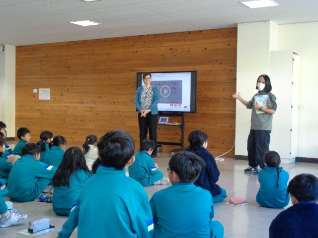 セーラ先生と外国語活動を行いました。 How are you? fine thank you. 子供たちは、書くことはまだできませんが英語を耳で覚え、元気に会話のやりとりしています。三角形や四角形、円や星など、たくさんの単語を教えていただきました。