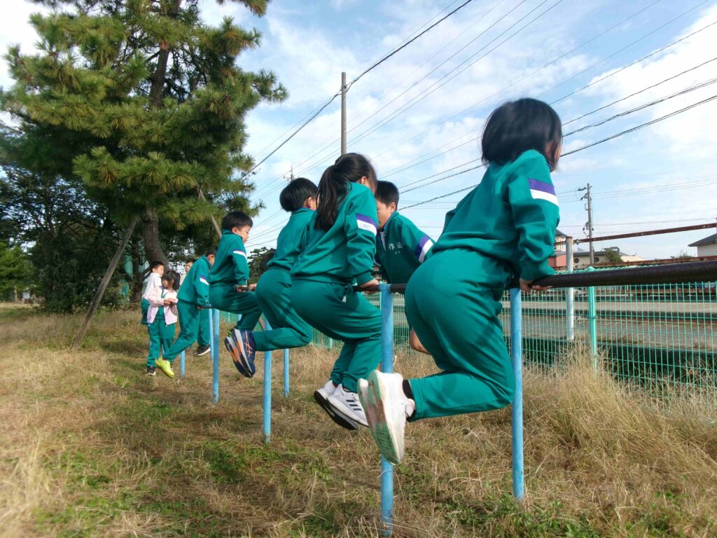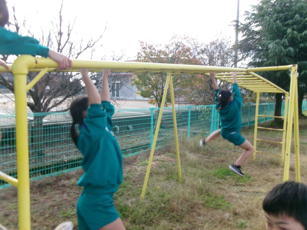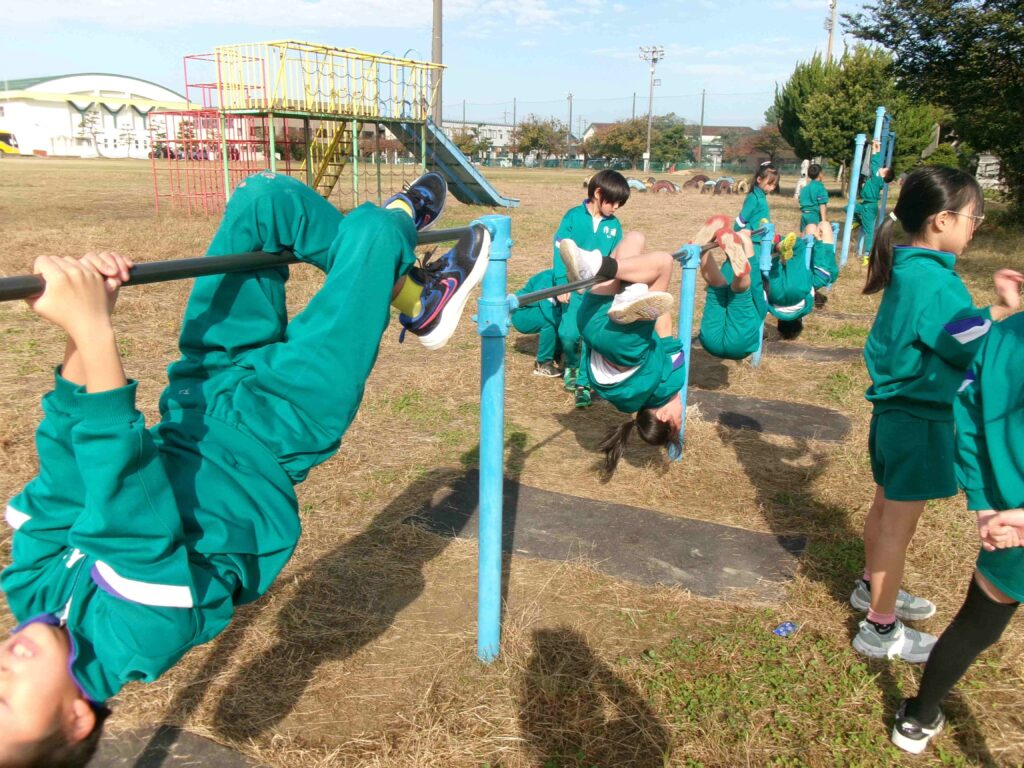 3年生は体育の授業で「鉄棒運動」に挑戦しました。自分の体をうまく支えたり、体を大きくふって回転したりして、できる技が増えるようにがんばっていました。