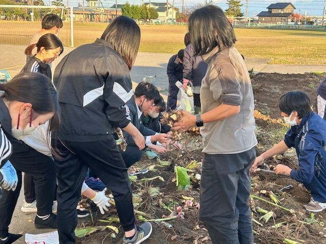 学校花壇も仕舞いの時期を迎えました。学校を彩ってくれた綺麗な花壇ですが、来年に向けて先生方全員で仕舞いました。たくさんの球根が土の下に隠れており、とても大変でした。刈り取った花は、軽トラック3台分にもなりました。来年もきれいな花壇づくりをしましょう。