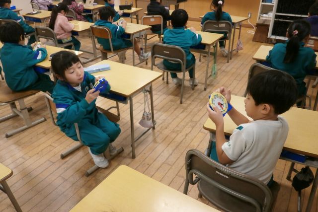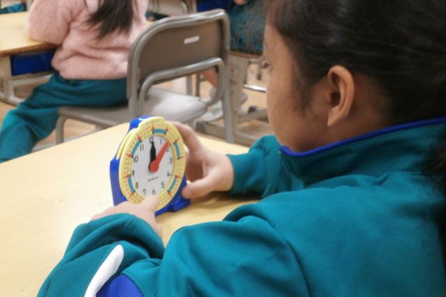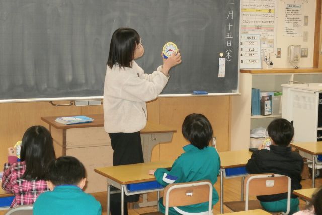 学校だより 1年生 算数(時計の読み方) Posted on 2026/01/15 1年生は、時計の模型を使って、時間を読み取る勉強をしています。9時10分に合わせてみましょう!の声に、児童らはできた様子をアピールしてくれました。
