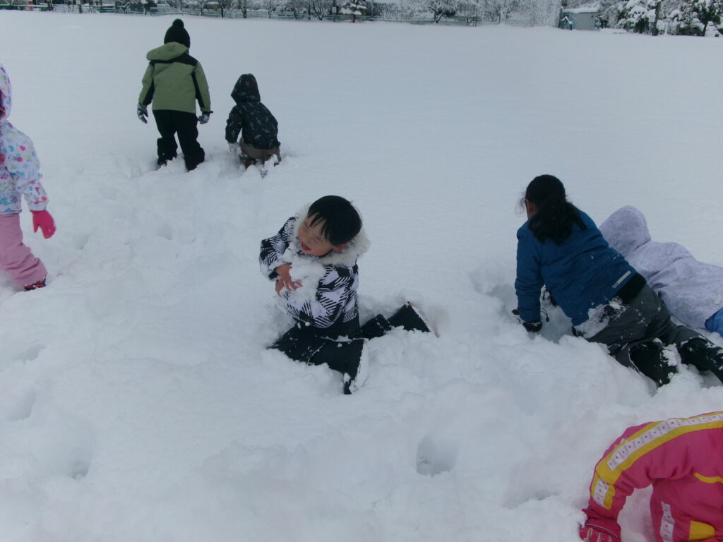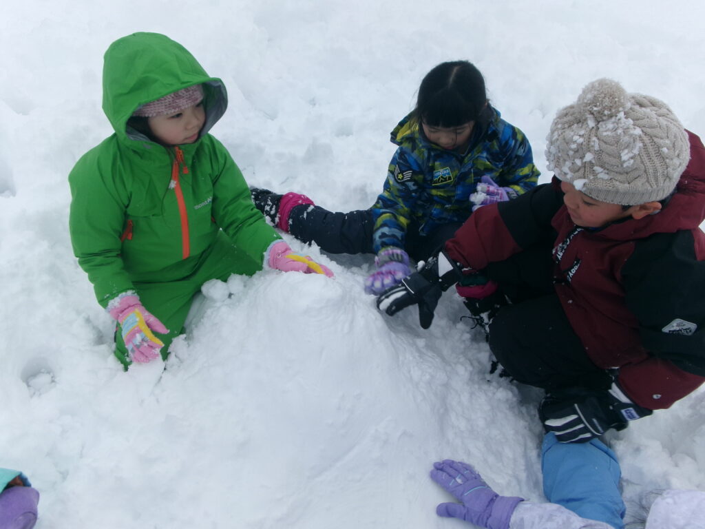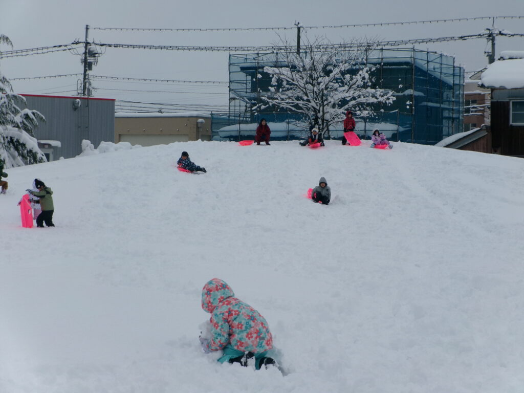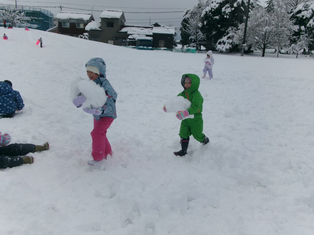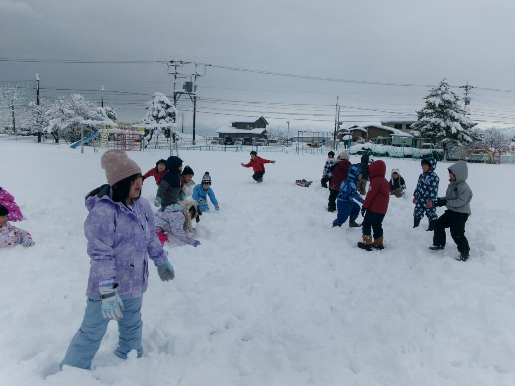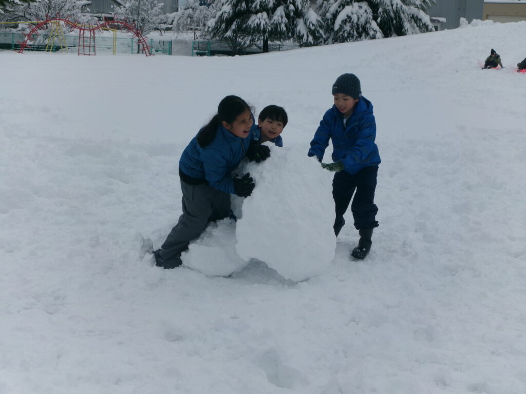外に出て、雪遊びをしました。友達と雪を丸めて雪だるまを作ったり、雪を集めてかまくらやトンネルを作ったりしました。また、雪玉を作って、雪合戦をしている児童もいました。築山では、山のてっぺんからそりをすべらせて、楽しく活動しました。
