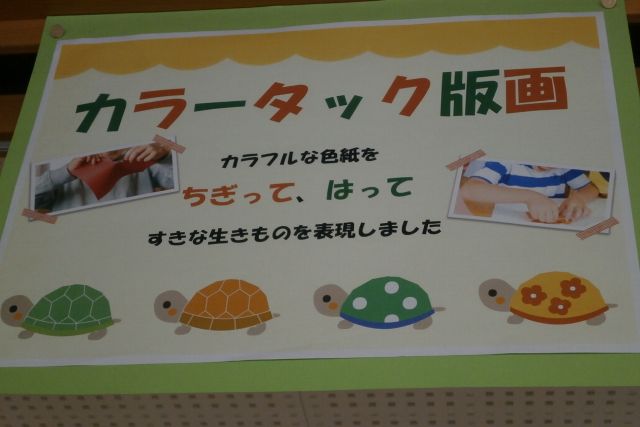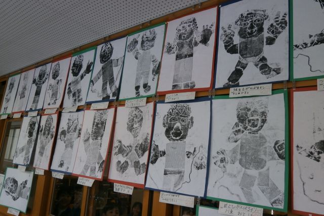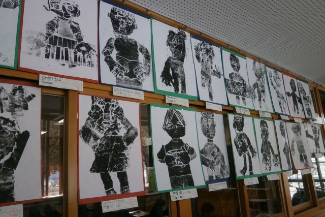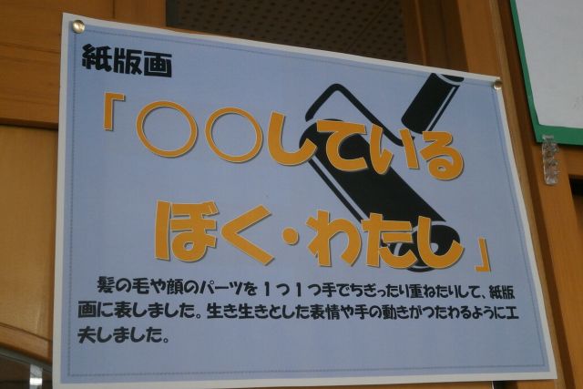 2年生は、「○○してる ぼく・わたし」と題して、絵版画に挑戦しました。顔や体のパーツを紙をちぎって作り、重ね合わせながら、自分を表現しました。愉快な表情や動きをした作品がたくさん飾られています。