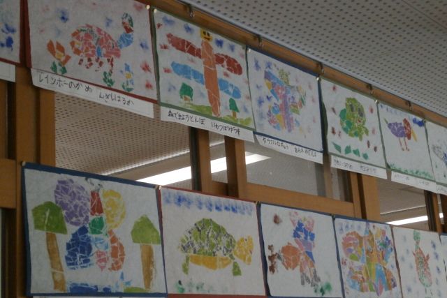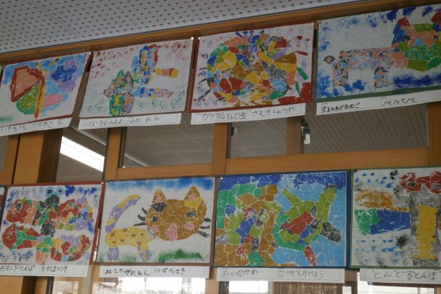 1年生は、図工の時間にカラフルな色紙をちぎって、はって、好きな生き物をイメージして作品を作りました。個性的な作品を作る児童がたくさんいました。何の絵かわかるかな?