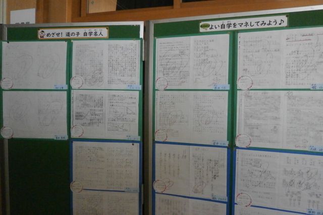 子供たちは、自主学習ノートを利用して、家庭で自学をしています。自学をしている児童のノートを掲示しました。丁寧な字で、きちんと整理されたノートを参考に今日から、みんな頑張りましょう。図書室前に掲示しています。学習参観でお越しの際には、是非、ご覧ください。