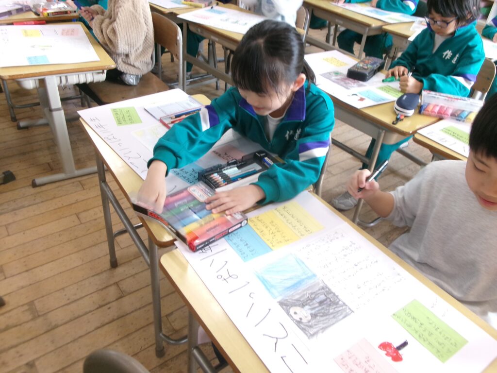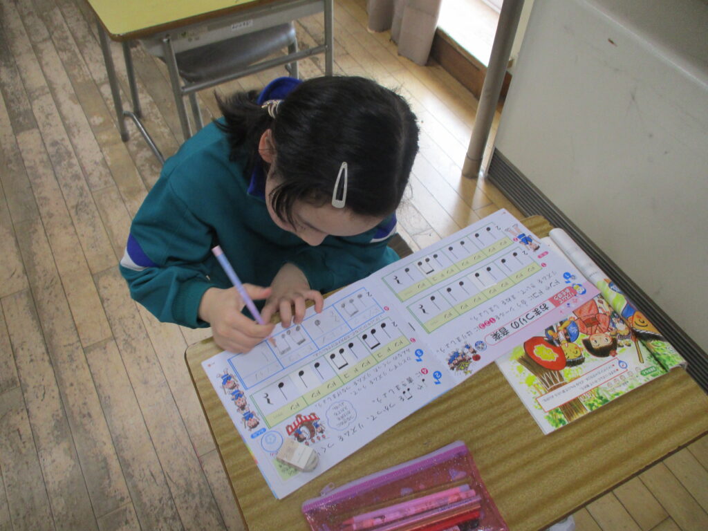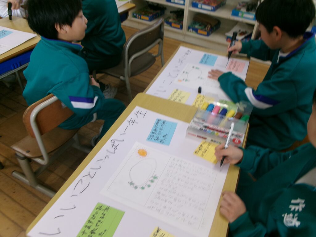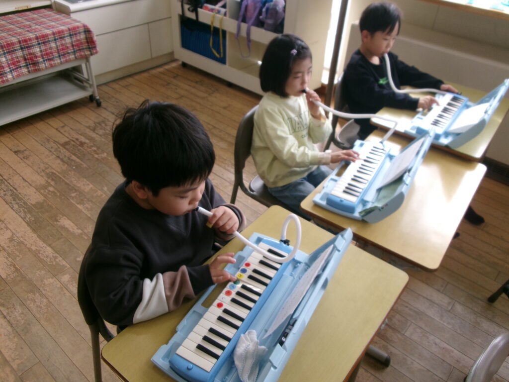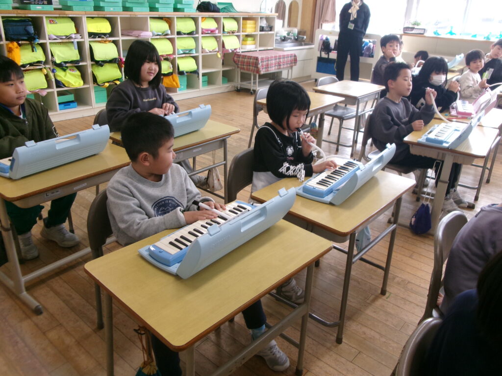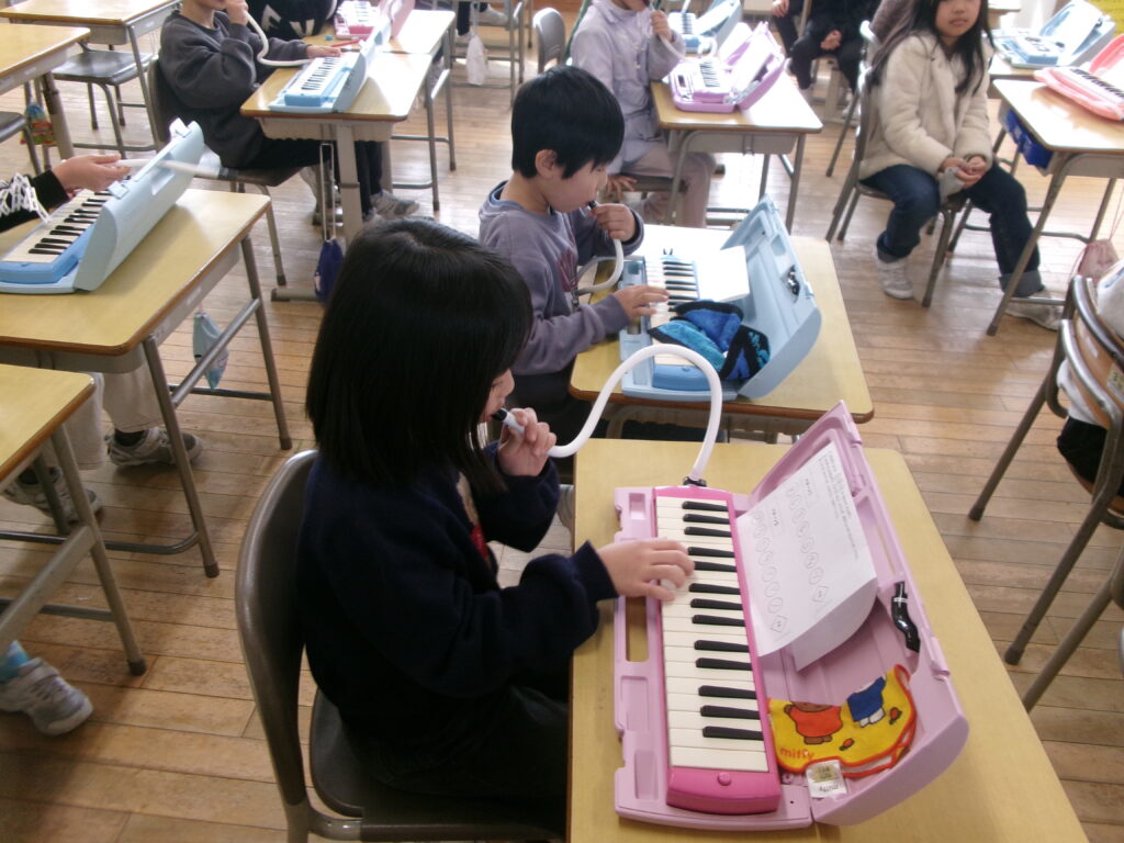 音楽の授業では、オリジナルの短いメロディーを作りました。隣の席の人と、それぞれが作ったメロディーをつなげたり重ねたりして、演奏を楽しみました。最後には、みんなの前で堂々と発表することができました。友達と息を合わせて演奏し、発表が終わると、教室は温かい拍手に包まれました。