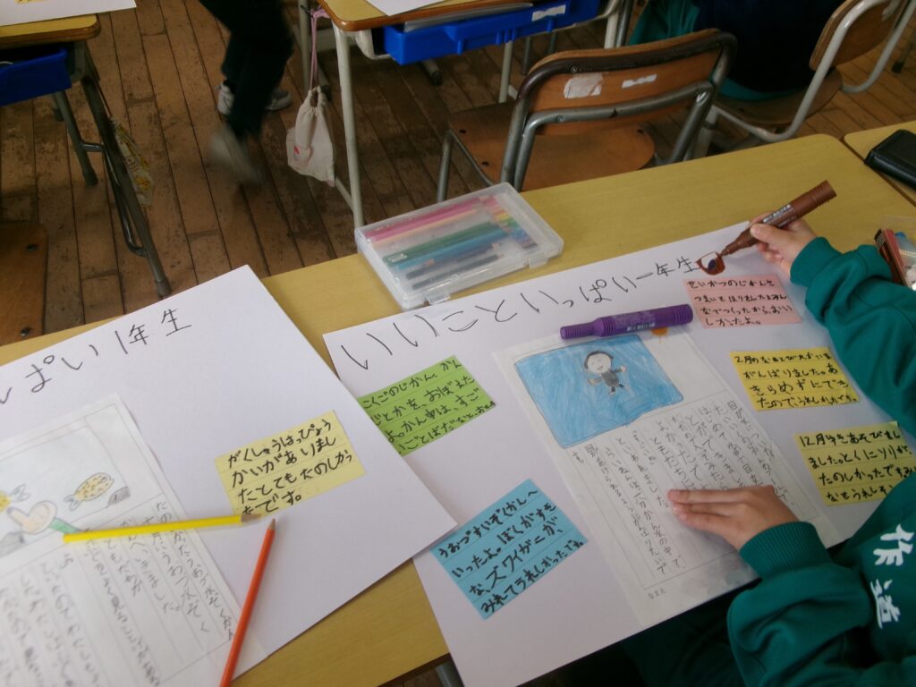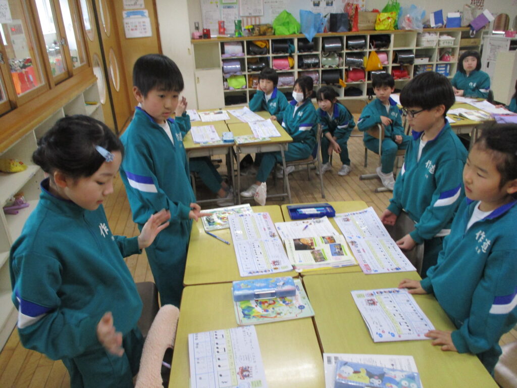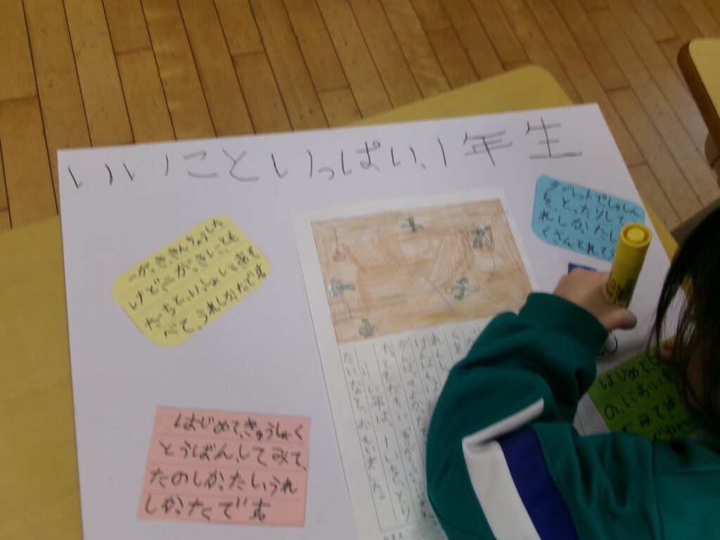 生活科では、1年生になってから頑張ったことや楽しかったことを、1枚の画用紙にまとめる学習をしました。運動会や学習発表会等の初めての学校行事や、新しくできた友達との思い出などを振り返り、どんなことが心に残っているのかを考えて書きました。一つ一つのできごとを思い出しながら、丁寧な字で一生懸命まとめることができました。