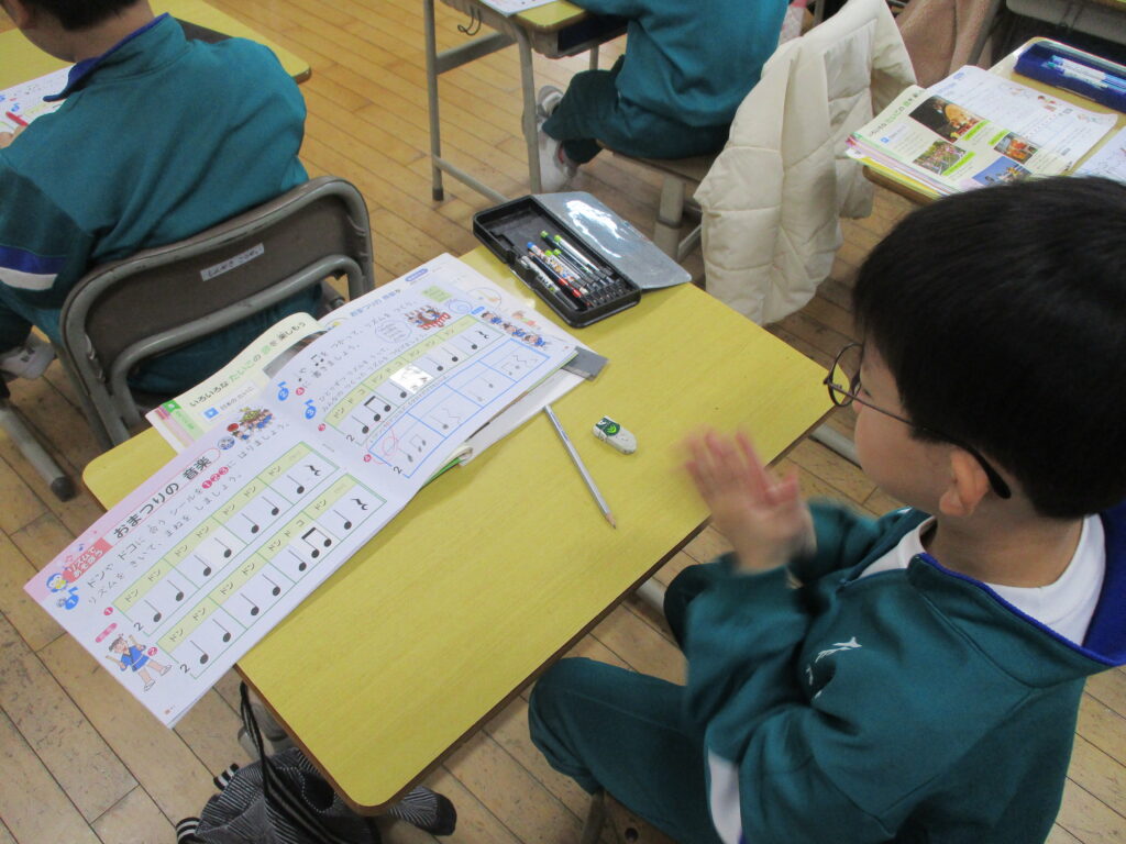 音楽の学習では、「おまつりの音楽」の学習を行いました。自分で太鼓のリズムをつくったり、つくったリズムを友達と繋げたりして、おまつりの音楽を楽しみました。
