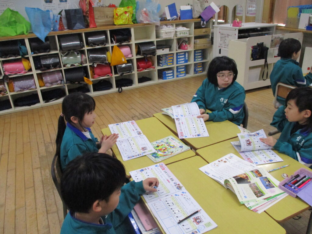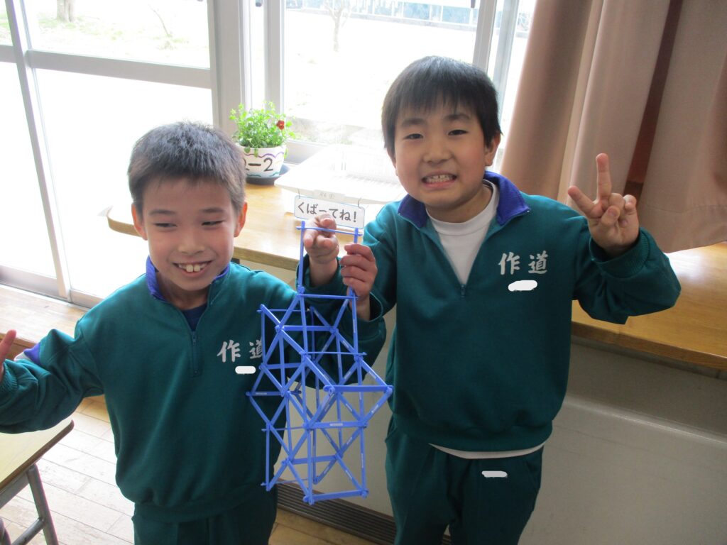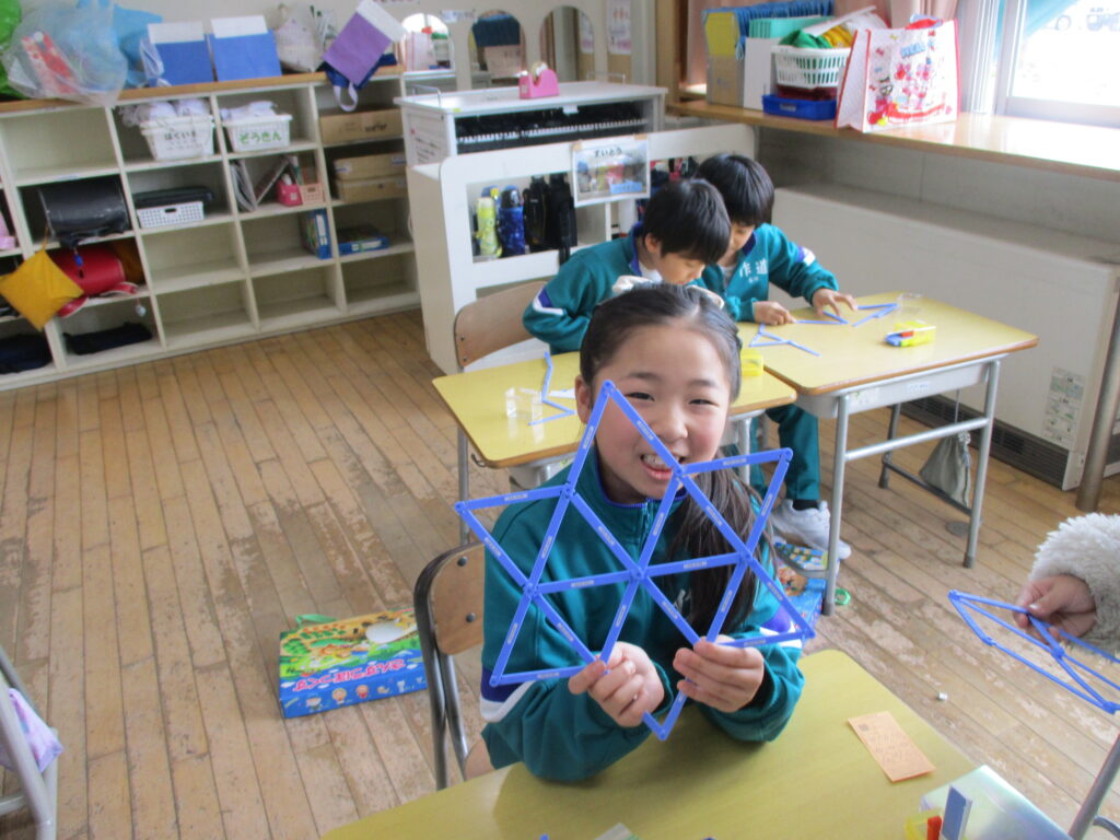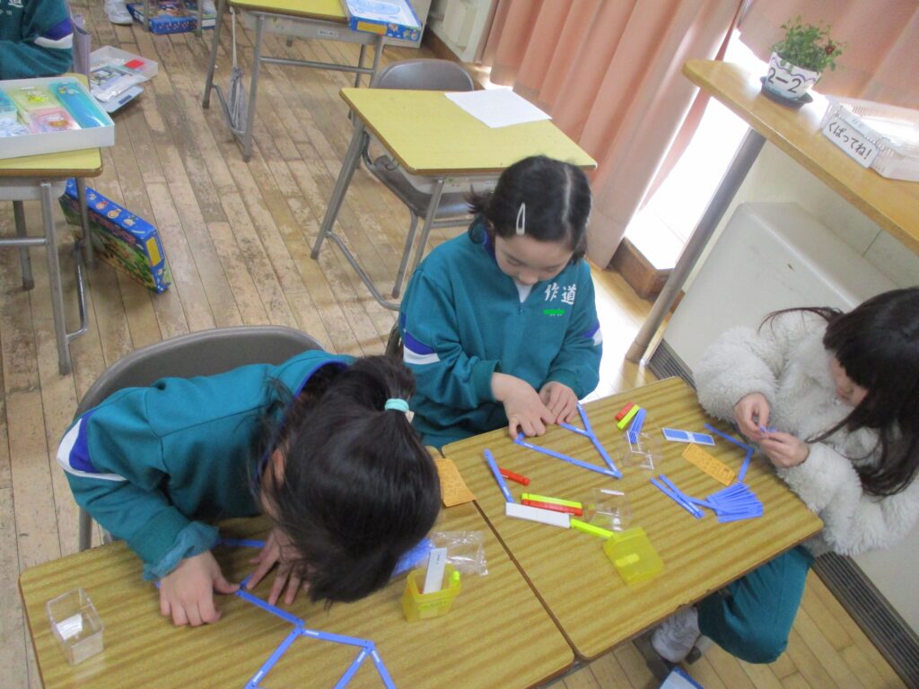算数ボックスの中にある棒を使って形づくりを行いました。「三角形や四角形があるよ!」「一本だけ動かすと、違う形ができたよ!」など、今までの学習を思い出したり、形づくりを楽しんだりしている様子でした。