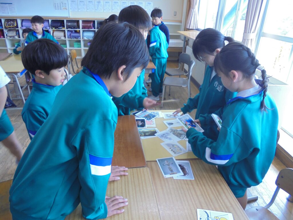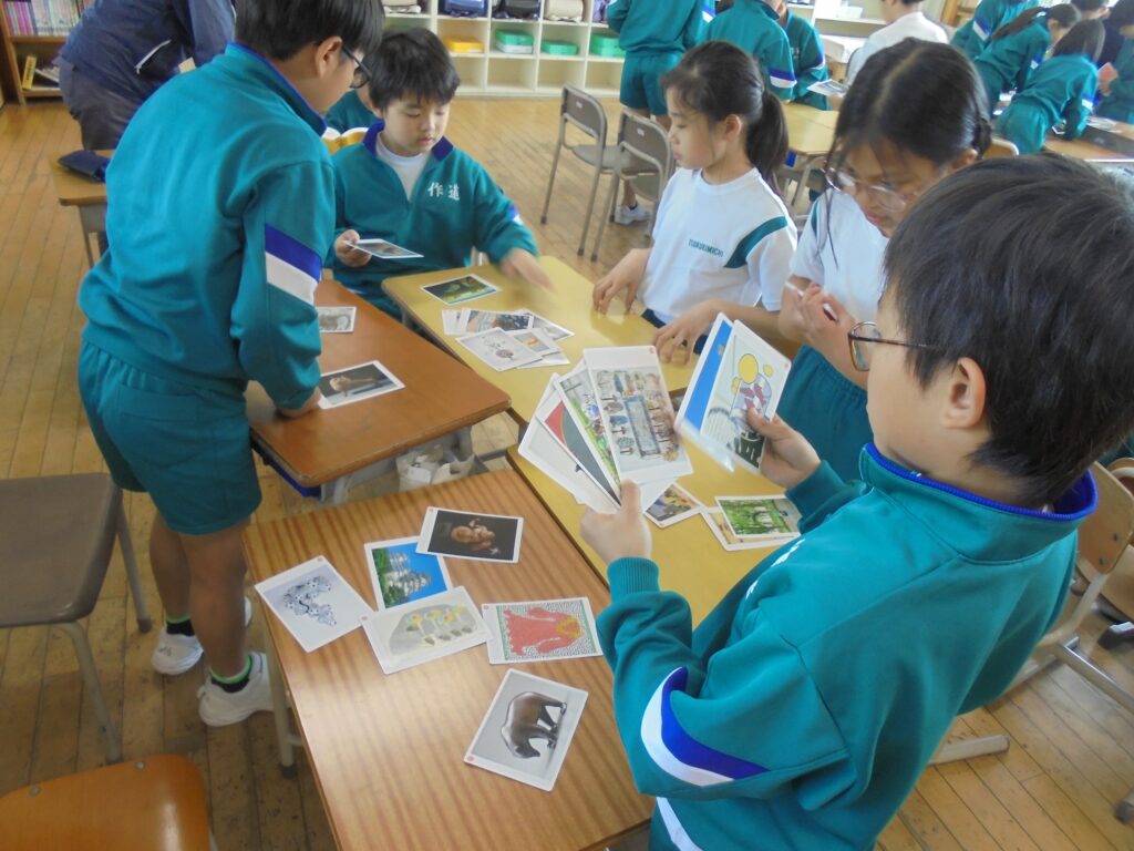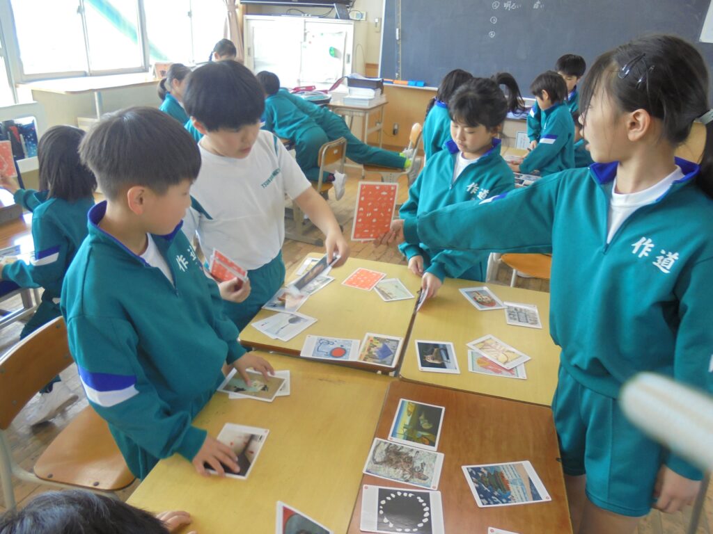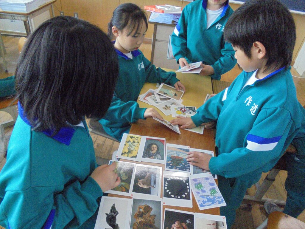 図工の授業でアートカードを使い、さまざまな作品を鑑賞した。グループで話し合いながら、お題に合わせてカードを分類したり、並べ替えたりした。