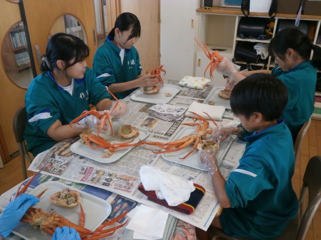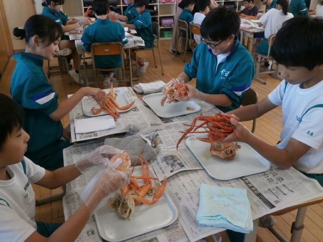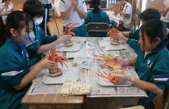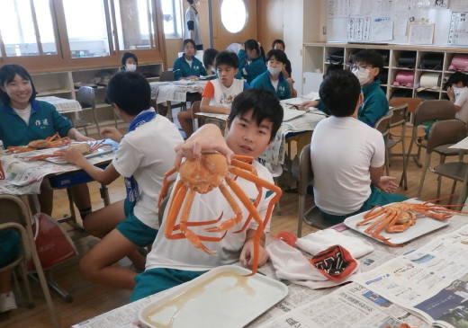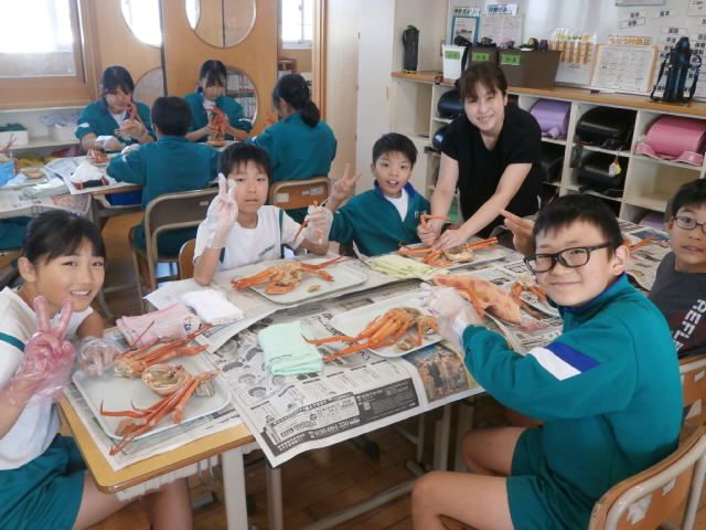 「おおきい!」「こんなおいしいかに、食べたことない!」「一人一杯あたるなんて幸せ!」教室ではそんな歓声があがりました。新湊漁業協同組合様のご厚意で、6年生は「かに」をごちそうになりました。本日、水揚げされた「かに」をその場で茹で、学校に直送されたものでした。いい塩加減で、足の先までびっしりと身が詰まった「かに」は、甘さが際立ち、たいへんおいしいものでした。漁協の皆様、毎年、幸せな時間をありがとうございます。
