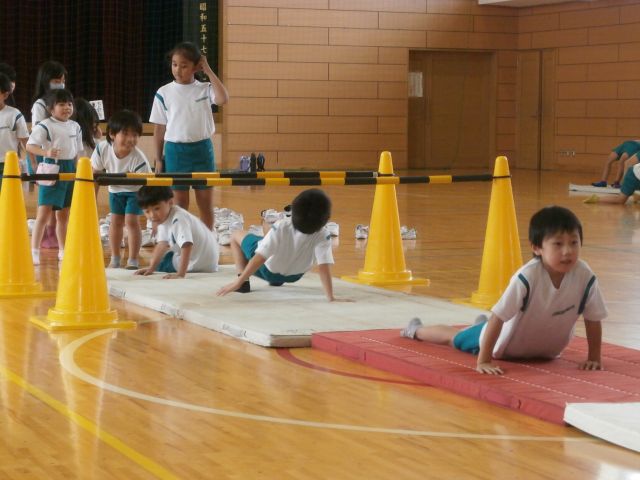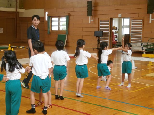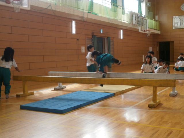1年生の体育です。子供たちは、とても体が柔らかくブリッジのトンネルをつくり、お友達が素早くくぐっていました。