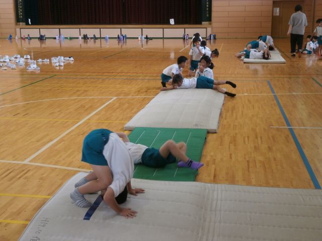 1年生はマット運動をしています。いろいろな動きをアザラシや蛙、熊など動物の動きに例えながら、4つの種目に挑戦しています。