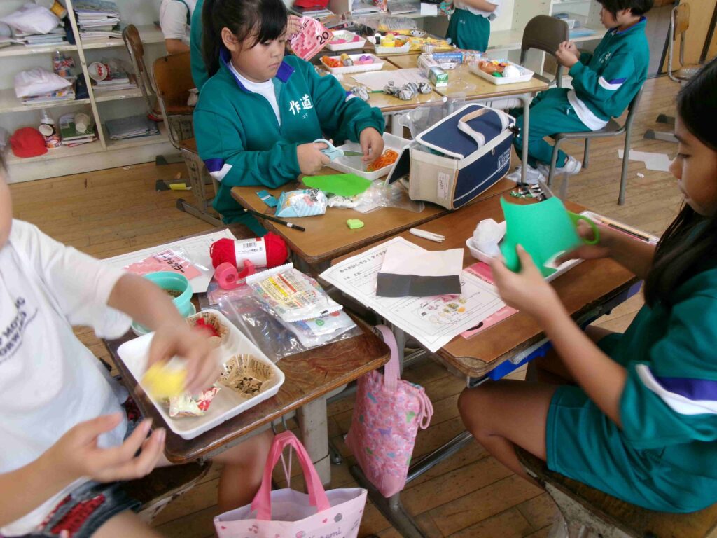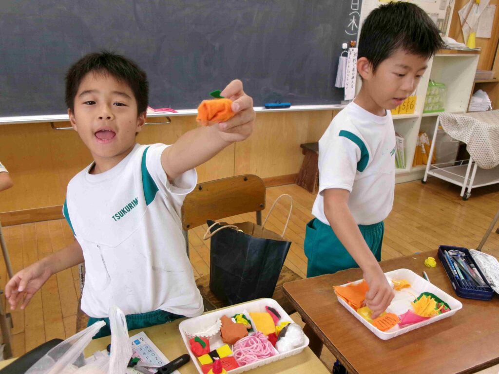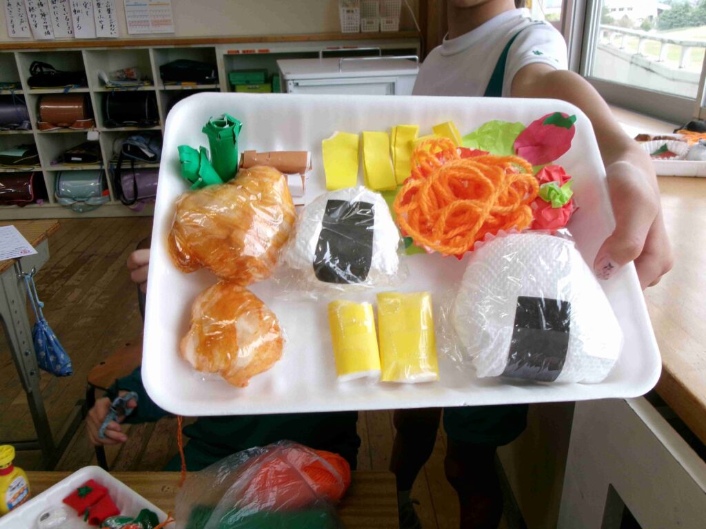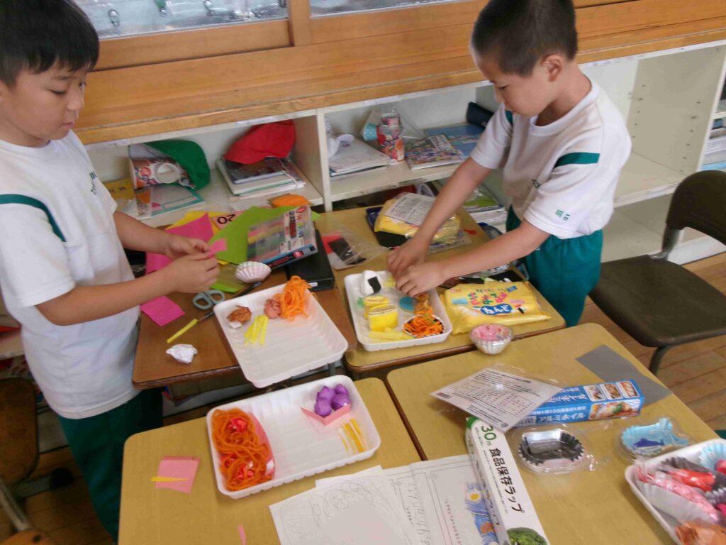 3年生では、図画工作科の授業でお弁当を作っています。毛糸でスパゲッティを作ったり、わたでおにぎりを作ったりと、それぞれ工夫しておいしそうな弁当を作っています。完成がとても楽しみです。