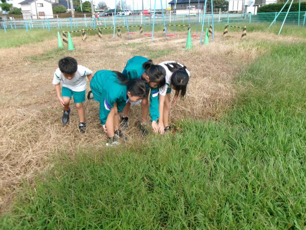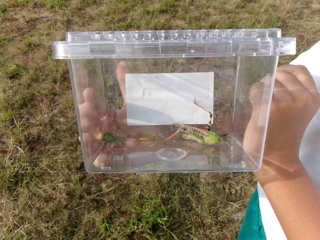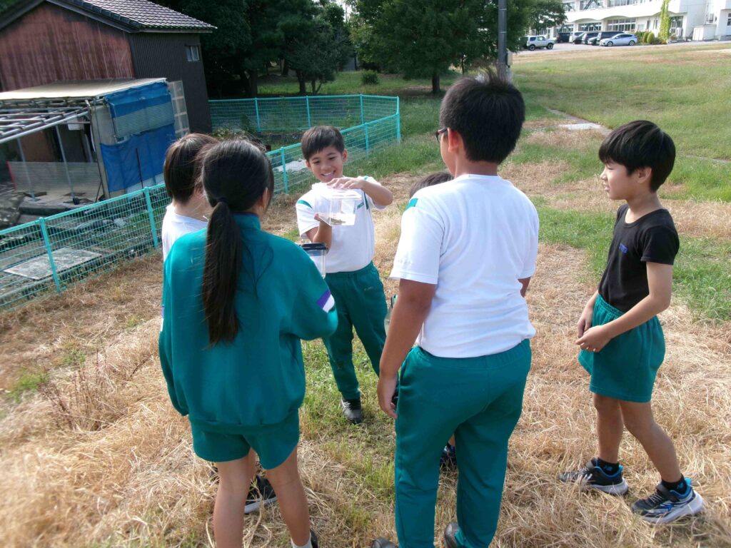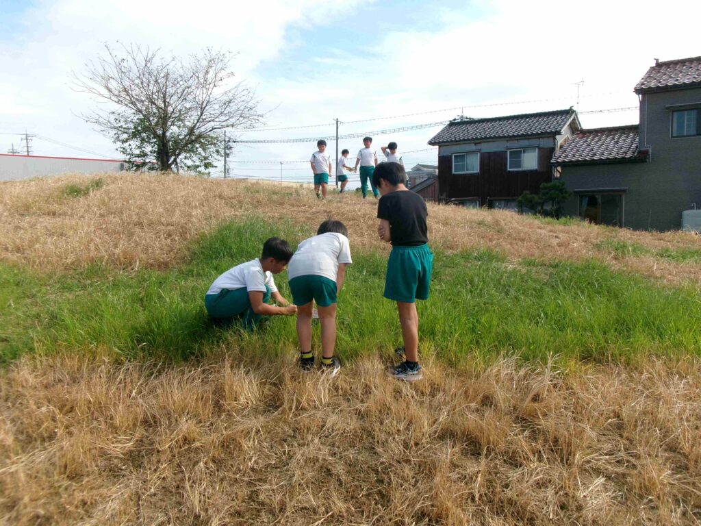 理科の授業で、虫探しを行いました。バッタやトンボ、コオロギなどの虫たちがいました。「大きいトノサマバッタ見つけた!」「幼虫もいる!」とたくさんの虫たちに、みんな大興奮でした。