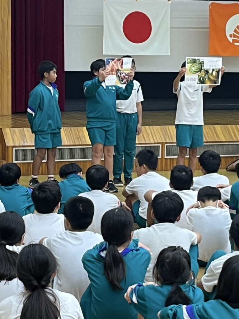 夕べの集いでは、各団体から紹介を行います。本校代表児童が、射水市の特徴や名産を含め、写真を見せながら分かりやすく学校の紹介をしました。