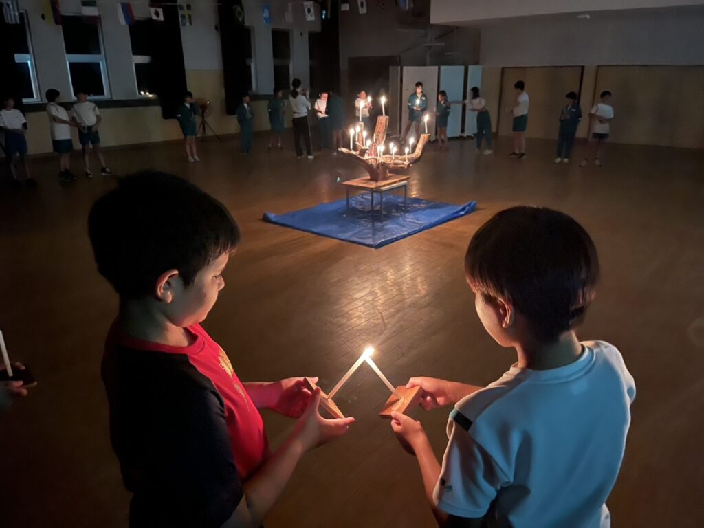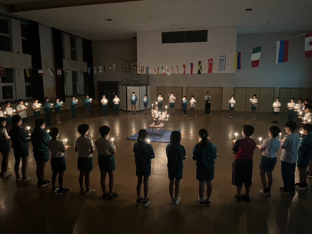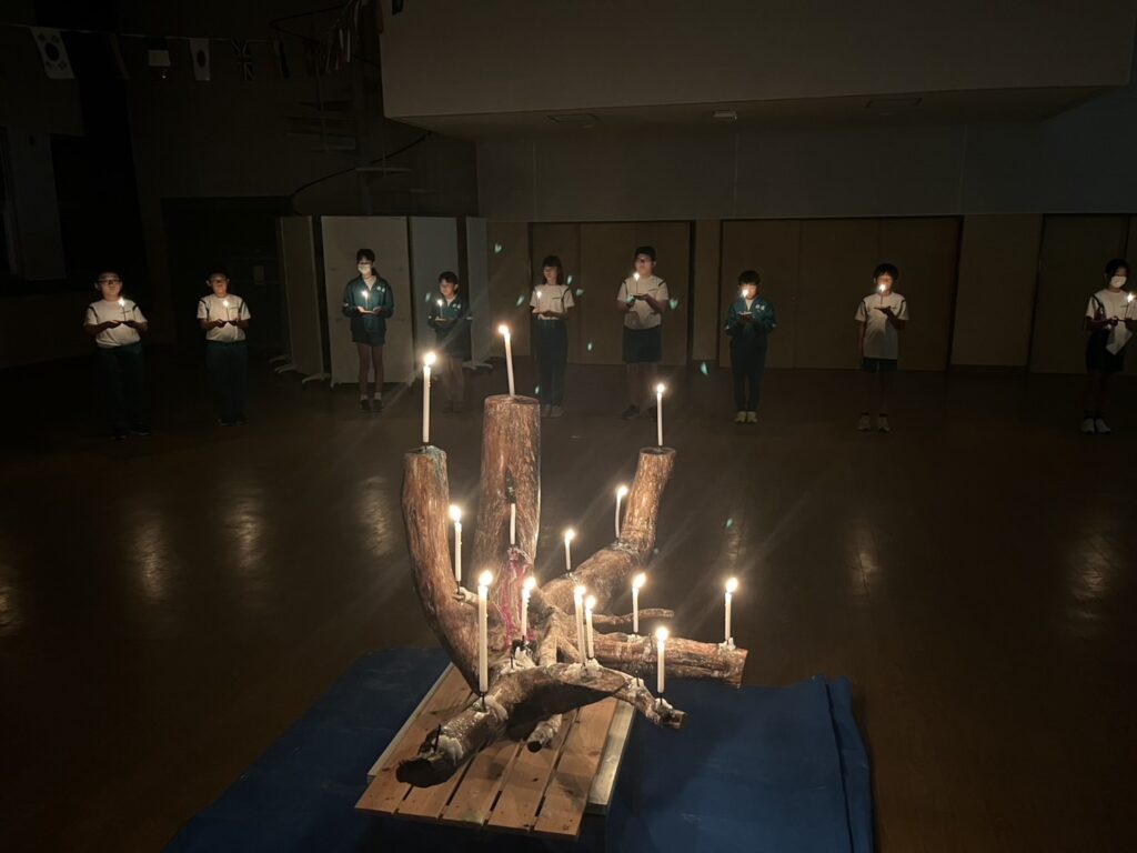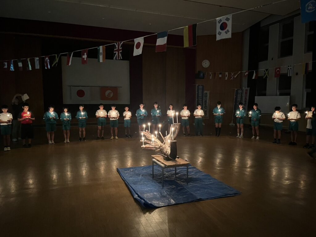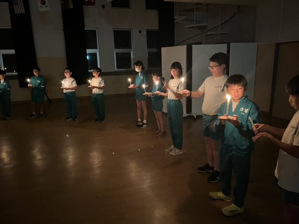 夜の活動は、キャンドルサービスを行いました。火の長より、火を扱う大切さを教えていただきました。一人一人のろうそくに火がともされた体育館では、周りの自然の呼吸だけが聞こえる静粛な時間を過ごしました。
